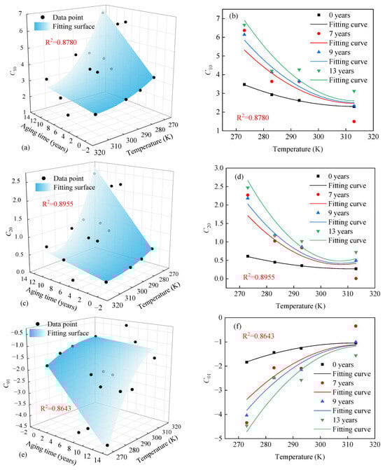Equation (11) was fitted with the experimental data using the nonlinear least squares method, and the fitting results are shown in Figure 12a–c. The fitted values of C10, C01, and C20 are presented in a two-dimensional graph, as shown in Figure 12d–f. In Figure 12, although the fitting results deviate from several individual data points, the whole trend is consistent with the distribution of the data. The fitted surface R2 values for C10, C01, and C20 are 0.878, 0.8955, and 0.8643, respectively. This shows that Equation (11) describes the temperature and aging-dependent evolution of these parameters well. The specific values of the fitted model parameters are listed in Table 4. By substituting the parameters into Equation (11), the temperature-dependent hyperelastic constitutive model for aged rubber can be expressed by Equations (10) and (11).
