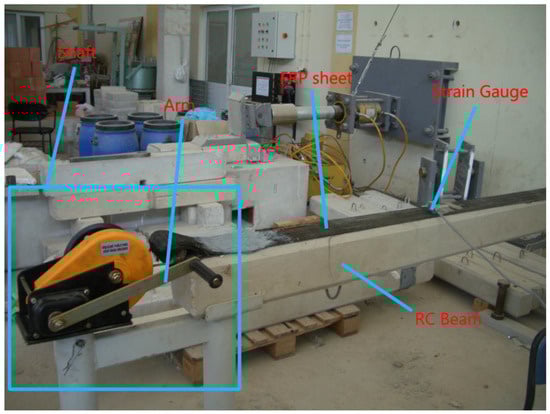 To apply the FRP, the concrete surface was first roughened to enhance bonding between the FRP and the concrete. The surface was cleaned using air, and epoxy resin was applied to the surface for bonding with the FRP. The FRP strip was initially placed on the beam for prestressed samples, with one end anchored. Subsequently, the FRP strip was prestressed using the EPM, as shown in Figure 1. Prestressing was carried out manually by a single person’s arm, and the amount of prestress was monitored using a strain gauge, which measured strain. Once the 0.001 mm/mm strain was achieved, epoxy resin was applied to the FRP. After the resin had cured, the EPM was removed, and the beam was left to cure for 2 weeks.