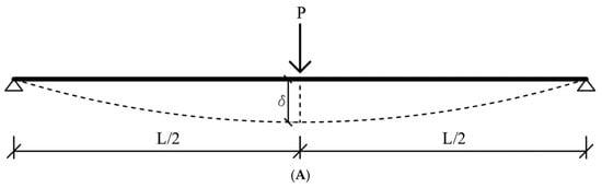 With the moments known, the corresponding load at that curvature can be determined using beam theory (see Equation (8)). It is important to note that the problem considered in this study involves three-point bending, so the formulas provided are specific to three-point bending. To calculate displacement, the second moment of inertia must be known. As illustrated in Figure 3, the stiffness of a RC beam in bending changes during loading due to tension cracking in concrete. Therefore, the inertia is not constant. Instead, the effective moment of inertia (Ieff) must be considered, which can be determined once the moment of that curvature is known (as shown in Equation (1)). After calculating the force and Ieff, the displacement at that curvature can be found using Equation (10).