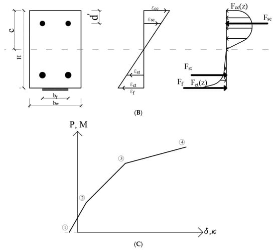 In the proposed approach, several assumptions were made. The primary goal is to capture the complete behavior of the load-displacement curve from the initial crack to failure (see Figure 3). In this context, material nonlinearities and FRP debonding strain are crucial factors. To accurately capture the behavior of the RC beam in bending, monitoring the load-displacement data step by step is more effective than focusing solely on failure modes. The partial interaction of materials, or semi-composite action, can be disregarded because the behavior is primarily influenced by concrete tension softening. During the experimental study, concrete cracking happened prematurely before failing in the concrete–FRP interface. The slip between concrete and FRP did not happen in experiments. Therefore, the general beam bending theory, or Euler beam theory, is applicable. As a result, the linear strain distribution is maintained throughout the loading process. This approach can determine the load-displacement relationship through section analysis at midspan, where the highest strain and stress occur due to loading. Since FRP debonding can be expressed in terms of strain, intermediate crack debonding can be directly captured from the midspan curvature, and other debonding modes can also be defined based on midspan deformation.