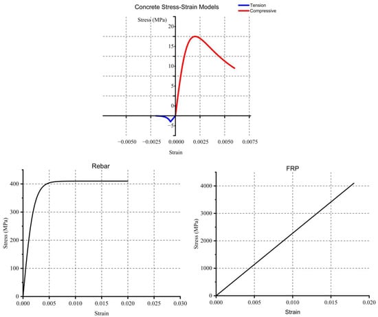 Being less complex, FRP material is modeled using a linear elastic relationship up to the failure strain, beyond which the stress drops to zero. The function in Equation (13) represents this. The failure strain is a critical parameter, as it can vary depending on the presence of an anchor and prestress. According to ACI 440, failure strain can be determined, with the anchor effect ignored in the calculation. However, if an anchor is present, ACI 440 suggests that the failure strain can be 90% of the failure strain for a non-anchored FRP.