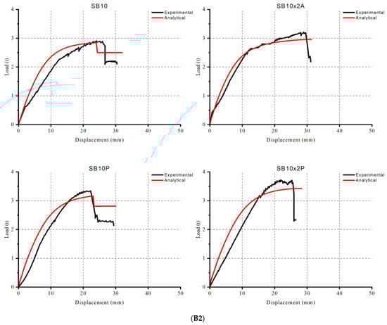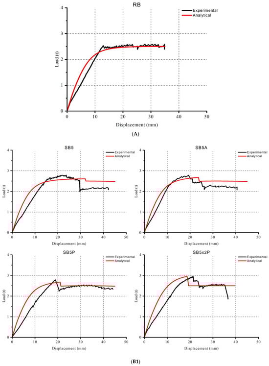 Experimental and analytical results. (A) Reference beam result. (B1) 50 mm strengthening results. (B2) 100 mm strengthening results.