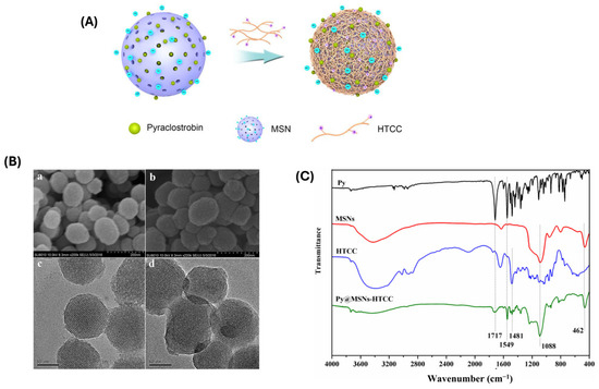 (A) Preparation of pyraclostrobin-loaded HTCC-capped mesoporous silica nanoparticles (MSNs); (B) (SEM) images of MSNs (a), pyraclostrobin-loaded HTCC-capped MSNs (b), Transmission electron microscopy (TEM) images of MSNs (c), and pyraclostrobin-loaded HTCC-capped MSNs (d); (C) FTIR spectra of pyraclostrobin (Py), MSNs, HTCC and Py@MSNs-HTCC. ref. [44].