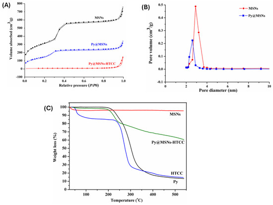 (A,B) Nitrogen adsorption–desorption isotherms of MSNs, Py@MSNs and Py@MSNs-HTCC, and pore-size-distribution curves of MSNs and Py@MSNs; (C) TGA of pyraclostrobin, MSNs, HTCC and Py@MSNs-HTCC. ref. [44].