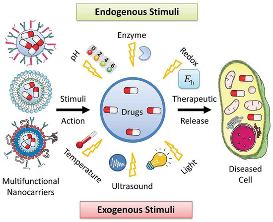 Schematic representation of different stimuli-responsive multifunctional nanocarriers (polymeric nanoparticles, liposomes, nanostructured lipid carriers, etc.) for targeted drug delivery applications. Reproduced with permission from Taylor & Francis, 2021, ref. [61].