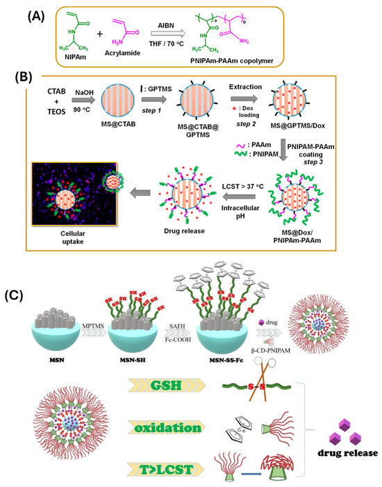 Schematic representation of the (A) synthesis of the PNIPAm-PAAm copolymer and (B) the MS@Dox/PNIPAm-PAAm NPs’ synthesis, surface modifications, drug loading, and release behavior. ref. [93]. (C) Formation of MSN-SS-Fc@β-CD-PNIPAM nanocarriers and a schematic illustration of drug release. ref. [94].