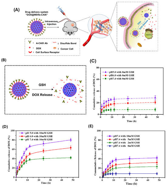 Several enzymes have been used for this purpose, including matrix metalloproteinases (MMPs), cathepsins, esterases, and proteases, which are commonly overexpressed in tumor tissues or inflamed regions. MMP-sensitive peptides or polymers can be grafted onto the MSN surface, causing MMP cleavage to dislodge the polymer gatekeeper and release the loaded drugs. Cai et al. [81] developed a colon-specific enzyme-responsive DDS based on an HMSS material (HMSS-N=N-CS) using a selective etching method. The polymer CS was linked to the surface of HMSS by azo linkages to operate as a gatekeeper, blocking the HMSS apertures. Enzymes can break the azo linkages between HMSS and CS, causing CS to separate from the HMSS apertures. DOX served as the model drug, and in vitro drug release tests revealed enzyme-responsive release in the presence of colonic enzymes (Figure 5A,B). Similarly, esterase-responsive polymers, such as polycaprolactone (PCL) or poly(β-amino esters), degrade in response to intracellular esterases, enabling drug release within endosomes or lysosomes [82].