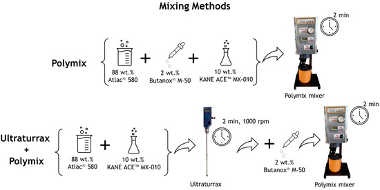 Two different mixing procedures were investigated to identify the method that achieved the best dispersion of the core–shell rubber particles contained in the KANE ACE™ MX-010 liquid modifier. In both procedures, 10 wt.% of KANE ACE™ MX-010 was combined with the resin and hardener (with the same ratio between the resin and hardener as adopted for the untoughened resin). In the first mixing procedure, an analogue procedure adopted for the untoughened resin was applied using the Polymix mixer and carrying out the mixing under vacuum for 2 min. In the second mixing procedure, the resin and the liquid impact modifier were initially mixed for 2 min in a Ultraturrax agitator (IKA-Werke, Staufen im Breisgau, Germany) at a velocity of 1000 rpm to ensure a higher mixing speed. Subsequently, the hardener was added, and the final mixture was blended under vacuum for 2 min with the Polymix to ensure the removal of any trapped air. The two adopted mixing procedures are schematized in Figure 2.