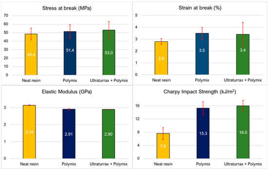 Toughened resins with three different weight percentages of liquid toughener (corresponding to 2, 4 and 6 wt.% of CSR) dispersed with the Ultraturrax and Polymix mixing method were thus investigated. In Figure 5, the results of the mechanical tests are summarized.