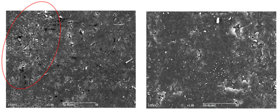 The Charpy impact strength also showed a significant increase, more than doubling from 7.6 kJ/m2 for the neat resin to 15.3 kJ/m2 with the Polymix method and 16.0 kJ/m2 with the Ultraturrax and Polymix method. This confirms that both methods were successful in dispersing the rubber phase and enhancing the material’s ability to absorb energy upon impact. However, the slightly higher impact achieved with the Ultraturrax method suggests a more uniform dispersion of CSR particles, likely due to the higher shear forces generated during mixing, which help to break up agglomerates and more evenly distribute the particles throughout the matrix [35]. The better and more uniform CSR dispersion achieved with the combination of Polymix and Ultraturrax was further confirmed by the SEM images reported in Figure 4. The red circle highlights an agglomeration of CSR particles in the mixing procedure in which only the Polymix was used. The agglomeration presence is proof that this was the worst mixing method that, consequently, had a lower toughening effect.