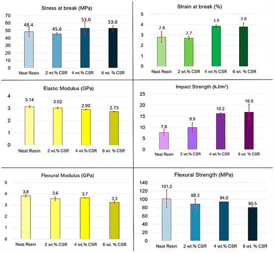The addition of CSR particles increased the strain at break and decreased the elastic modulus of the resin. These results are coherent with the literature [42,43] and are primarily attributed to the lower elastic modulus of the CSR particles compared with the thermoset matrix, which introduces more compliant domains within the material and facilitates energy dissipation during deformation. Regarding the tensile stress at break, no substantial variation was observed with the addition of CSR particles.