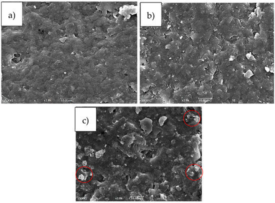SEM images at a magnification of 2000× of (a) 2 wt.% CSR, (b) 4 wt.% CSR and (c) 6 wt.% CSR.
