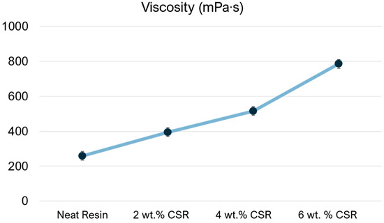 It was observed that the addition of 6 wt.% CSR resulted in a viscosity increase that could potentially hinder the resin infusion process.