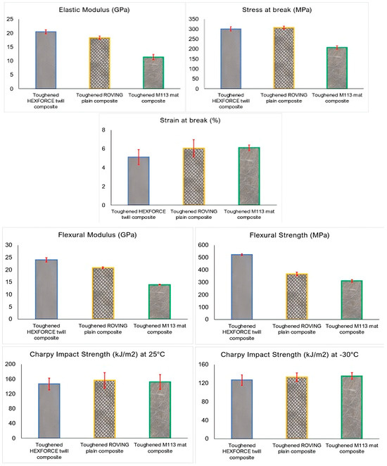 To assess how fabric architecture influences the mechanical response of rubber-toughened glass fiber-based composites, three reinforcement types, HEXFORCE® twill, ROVING plain weave, and M113 chopped strand mat, were compared using the optimized toughened resin (4 wt.% CSR) as the matrix. Figure 10 summarizes elastic modulus, tensile strength, strain at break, flexural modulus/strength, and Charpy impact energy at 25 °C and −30 °C.