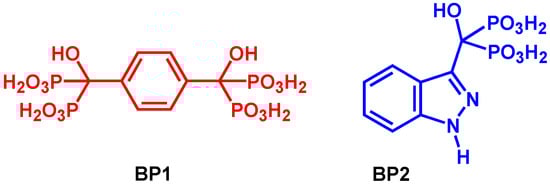 Dopants [1,4-phenylenebis(hydroxymethanetriyl)]tetrakis(phosphonic acid) (BP1) and [hydroxy(1H-indazol-3-yl)methanediyl]bis(phosphonic acid) (BP2) were synthesized in conditions already established within the group [38,39]. Their chemical structures are shown in Figure 1.