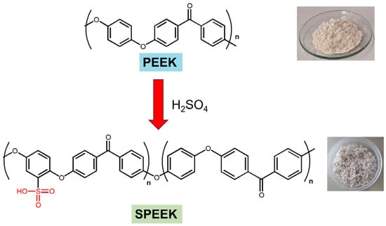 SPEEK polymer was prepared by sulfonation of PEEK with sulfuric acid, and its degree of sulfonation was determined by 1H NMR. PEEK particles were dried at 100 °C overnight. Dried PEEK (2 g) was progressively added to concentrated sulfuric acid (40 mL). The mixture was vigorously stirred for 5 days at room temperature under a nitrogen atmosphere. Then, the solution was added slowly to ice-cold water to precipitate the polymer. The mixture was stirred for 2 h and left to rest for 24 h. After filtration, the solid SPEEK polymer was washed with deionized water several times until neutral pH solutions were discarded. The resulting solid SPEEK was then dried at room temperature and at 80 °C for 24 h (Figure 2).