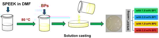 New SPEEK membranes were prepared by a casting method (Figure 3). The SPEEK polymer was dissolved in the corresponding amount of DMF to form a 10 wt% solution of SPEEK at 80 °C for 1 h. Then, different amounts of BPs (1.0 or 2.0 wt% of BP1 and BP2 dopants) were added to the solution, and the mixtures were stirred at 80 °C for 1 h to ensure their complete dissolution. The obtained solutions were cast in a Petri dish, and the solvent was slowly evaporated to obtain a homogeneous membrane. The new membranes were firstly dried in a vacuum oven at 80 °C, followed by the annelation process through their heating at 100 °C for 2 h. The membranes showed an average thickness of 136 µm.