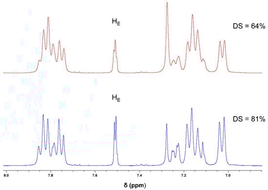 The new membranes were prepared from SPEEK polymer. This base polymer was prepared from the sulfonation reaction of PEEK with concentrated sulfuric acid at room temperature (Figure 2). Different reaction times of this sulfonation process promote different values of the degree of sulfonation (DS) [41,42]. With the sulfonation of the polymer backbone, it was observed a characteristic signal of HE proton (Figure 4) at 1H NMR spectra (Figure 5), at deuterated DMSO solvent, with a chemical shift near 7.5 ppm. The intensity of this singlet allowed the determination of the degree of the sulfonation of the samples obtained after 5 days (DS = 64%) and 12 days (DS = 81%) reaction times, using Equation (3).