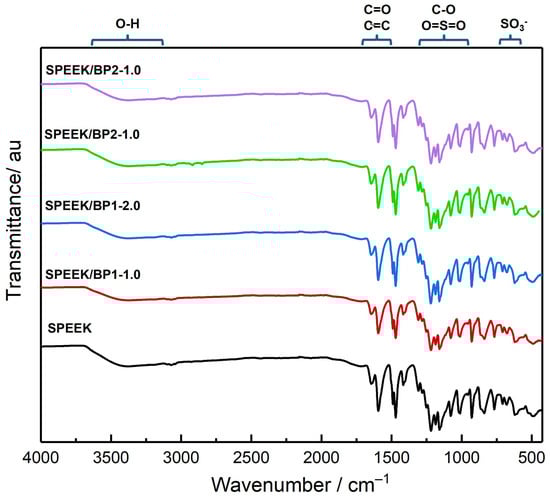 The newly prepared membranes were characterized by ATR-FTIR, and the morphological analysis of their surface was carried out by SEM. The ATR-FTIR spectra (Figure 7) present prominent bands corresponding to the sulfonic and carbonyl groups of the SPEEK. These bands, most of them with high intensity, mask the characteristic bands of dopants, with no independent bands of dopants visible at the spectra and no significant changes in the spectra due to the incorporation of the BP at these very low concentrations.