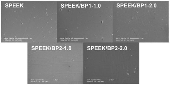 The morphology analysis of the membranes afforded SEM micrographs (Figure 8) that showed a compact and dense surface with no cracks or wrinkles. The full homogeneity of their surface is only lost at pristine and BP1 membranes, where a few small craters or cavities can be seen at the surface. A few creases or lines were observed at the surface of membranes doped with BP2, formed during the drying process.