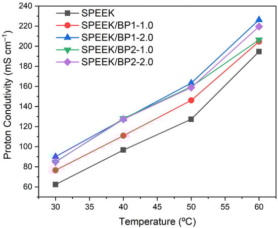 The proton conduction properties of the new doped membranes were assessed by Electrochemical Impedance Spectroscopy (EIS); the pristine membrane was also evaluated for comparison. All membranes were tested at 30 °C, 40 °C, 50 °C and 60 °C temperature conditions to evaluate the proton conductivity dependency with temperature. The results showed that the proton conductivity increased with temperature, with all membranes presenting an increase in proton conductivity with the increment of temperature, with the pristine SPEEK membrane showing a 3-fold increase and the doped membranes a nearly 2.5-fold increase between 30 °C and 60 °C (Figure 9). Despite this higher increase of proton conductivity of the pristine membrane, all membranes doped with BP showed high proton conductivity at all tested temperatures.