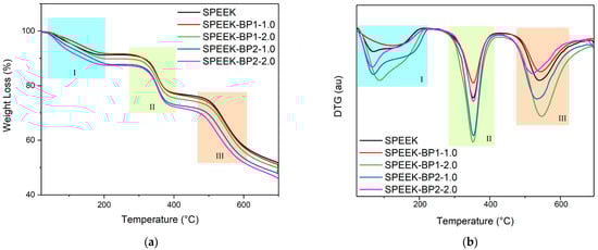 The second temperature range is observed between approximately 250 °C and 400 °C. These thermal losses of weight can be attributed to the thermal degradation of sulfonic acid groups and the dopants. At this temperature range, the pristine membrane showed the lower mass variation with a 14.5% loss, with the other membranes showing values from 14.9% (membrane doped with BP1 at 1.0 wt%) to 15.6% (membrane doped with BP2 at 2.0 wt%). The center of these temperature ranges is similar to the pristine SPEEK membrane and the other doped membranes (near 352 °C) [63].