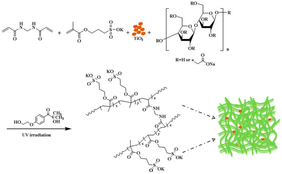 The gel-like solid was obtained by the reaction of three monomers, namely, CMC, MBA, and SPMA, initiated by 2-hydroxy-4′-(2-hydroxyethoxy)-2-methylphenylacetone and TiO2. The reaction equation is shown in Figure 1.