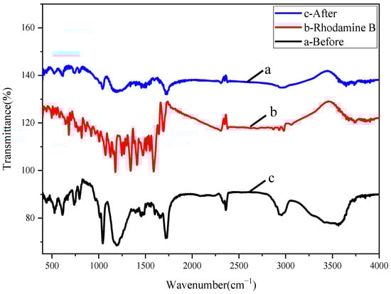 Infrared absorption spectra of P(CMC-SPMA-MBA) before and after dye adsorption: (a) Before adsorption. (b) Rhodamine B. (c) After adsorption.