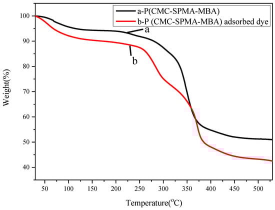 Thermal analysis chart of P(CMC-SPMA-MBA): (a) Before adsorption and (b) after adsorption.