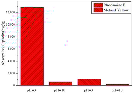 Through the comparative analysis of Figure 5, it can be seen that, in acidic environments, the copolymer has a poor adsorption effect on soap yellow, with an adsorption capacity of 633.53 mg/g, while it has a relatively significant adsorption effect on Rhodamine B, with an adsorption capacity of up to 12,869.02 mg/g. Through the comparative analysis of Figure 5, it was found that, under alkaline conditions, the copolymer had almost no adsorption effect on soap yellow, with an adsorption capacity of only 175.61 mg/g. In contrast, the adsorption effect for Rhodamine B was good, with an adsorption capacity of up to 1053.69 mg/g. As Rhodamine B is a cationic dye, it exists in a cationic form in acidic environments, and the P(CMC-SPMA-MBA) contains sulfonic acid groups, which attract the cations in Rhodamine B, resulting in the highest adsorption capacity.