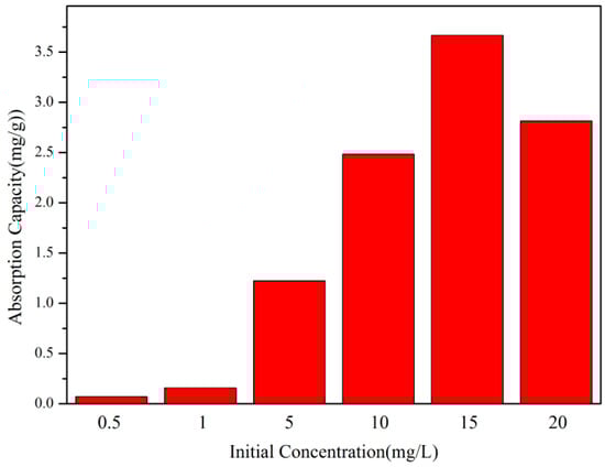 According to Figure 7, under the condition of keeping other factors constant, as the initial concentration of the dye solution increases, the adsorption capacity of the copolymer per unit mass continues to increase. When the initial concentration of the dye solution exceeds 15 mg/L, the adsorption capacity decreases. When the concentration is 15 mg/L, the adsorption capacity is the highest (3.67 mg/g). The initial concentration of the dye solution gradually increases, and the adsorption capacity increases linearly. When the initial concentration of the dye solution exceeds 20 mg/L, the increase in adsorption capacity accelerates, and when it exceeds 20 mg/L, the adsorption capacity decreases. The reason for this is that when the dye solution concentration is low, there are still some adsorption sites, while when the dye concentration is high, the driving force for mass transfer is higher.
