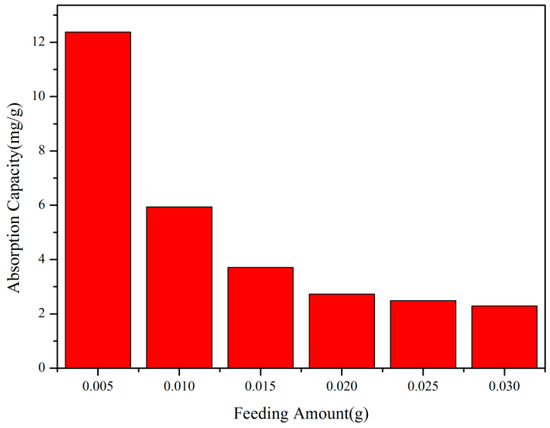According to Figure 8, it can be seen that, keeping other factors constant, the adsorption reaction was carried out in 10 mL of Rhodamine B dye solution. When the dosage was within the range of 0.005–0.01 g, the adsorption capacity per unit mass of copolymer increased rapidly with the increase in the copolymer dosage. When the dosage was within the range of 0.01–0.03 g, the adsorption capacity per unit mass of copolymer increased rapidly with the increase in the copolymer dosage. When the dosage was 0.005 g, the adsorption capacity reached a maximum of 12.37 mg/g.