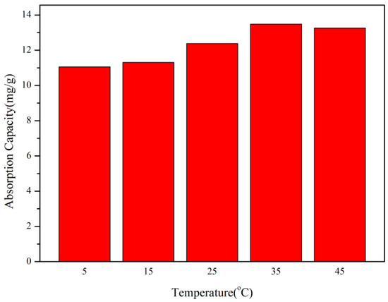 According to Figure 9, it can be seen that, under the condition of keeping other factors constant, when the reaction temperature is in the range of 5–35 °C, the adsorption amount of copolymer per unit mass gradually increases with the increase in the reaction temperature. When the reaction temperature is within the range of 35–45 °C, the adsorption capacity of the copolymer per unit mass decreases with the increase in the reaction temperature. When the temperature of the reaction environment is 35 °C, the highest adsorption capacity is 13.48 mg/g. This indicates that high temperatures are beneficial for the adsorption of cationic dyes on copolymers. The positive correlation between environmental temperature and dye adsorption can be attributed to the increased permeability of dye molecules on copolymers. With the increase in temperature, the solvent molecules remaining in the gel will be removed, and the dye molecules will obtain more adsorption sites, thus increasing the adsorption capacity of the dye [28], and the diffusion of the adsorbent molecules from the dye solution to the adsorbent will increase faster.