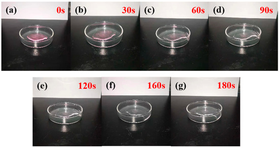 We took 0.02 g of P(CMC-SPMA-MBA) and placed it in 10 mL of 5 mg/L Rhodamine B staining solution, controlling its pH at 3, and then we shook the solution thoroughly at 35 °C for 20 min. After centrifugation, we removed the upper clear liquid and irradiated it with UV light for 30 s, 60 s, 90 s, 120 s, 150 s, or 180 s. The change process is shown in Figure 11. After 180 s of irradiation, P(CMC-SPMA-MBA) adsorbed with Rhodamine B was completely degraded and turned into a colorless and transparent liquid. The results showed that TiO2 had a great influence on the photocatalytic degradation of the Rhodamine B and copolymers.