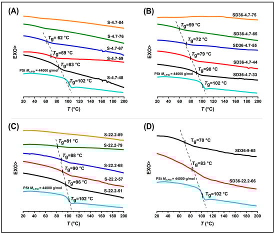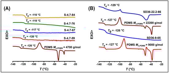 Figure 1 and Figure 2 show the DSC scans in the temperature ranges of −150–0 °C and 0–200 °C for detecting the thermal transitions of the PDMS and PSt components, respectively. These figures clearly indicate that the Tgs of both components can be detected in the PSt-l-PDMS and PSt-l-PDMS/DVB conetworks. Specifically, there is one glass transition near the Tg of the PDMS homopolymers, and another one for the PSt component in the higher temperature region of the DSC measurements. Evidently, the two separate glass transitions mean microphase separation of the PSt and the PDMS domains with significant segregation in these conetworks, which is consistent with previous reported SAXS and AFM results [73]. It must be noted that the glass transition of the PSt component with sufficient certainty cannot be detected in conetworks with low PSt contents (i.e., less than ~25 wt%), as shown in Figure 2A–C. As displayed in Figure 1, the PDMS homopolymers have Tgs, cold crystallization, and melting transitions in the temperature ranges as expected on the basis of literature reports [78,79,80,81,82,83,89,90]. However, signals indicating crystallization of PDMS cannot be detected in both the PSt-l-PDMS and PSt-l-PDMS/DVB conetworks with PDMS macrocrosslinkers having Mn,PDMS of 4.7 and 9 kDa. This means that crystallization of the PDMS component in these conetworks is fully prevented, which is attributed to the nanoconfined constraints of the PDMS nanodomains by the PSt nanophases in the bicontinuous nanophasic morphological structure of these conetworks [73]. Similar findings were recently reported for block copolymers of poly(poly(ethylene glycol) acrylate) (PEGA76) with poly(2-hydroxyethyl acrylate-polyhexanoate), that is, decrease in the crystalline fraction of PEGA76 by decreasing its fraction, but having nearly constant Tg of this component [91]. Weak cold crystallization and melting peaks appear in the DSC scan of the conetwork prepared with the MA-PDMS-MA macrocrosslinker with Mn,PDMS of 22.2 kDa (Figure 1B). This is presumably due to the higher mobility of the longer PDMS chains in this case.