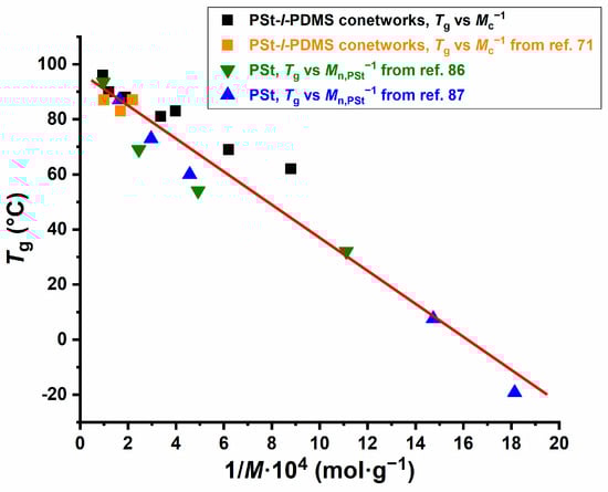 The Tg of the PSt component of PSt-l-PDMS conetworks (black and light brown) as a function 1/Mc, and the Tg of PSt homopolymers as a function 1/Mn,PSt (green and blue). Data from Refs. [71,86,87].