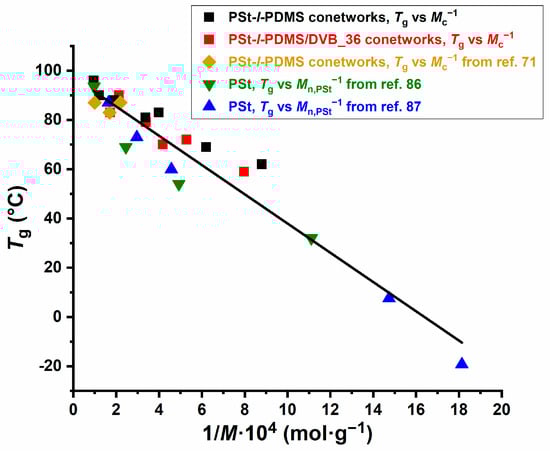 The Fox–Flory plot of the glass transition temperatures (Tg) of the PSt component of the PSt-l-PDMS conetworks with PDMS macrocrosslinkers containing Mn,PDMS of 4.7 and 22.2 kDa as a function of 1/Mc.