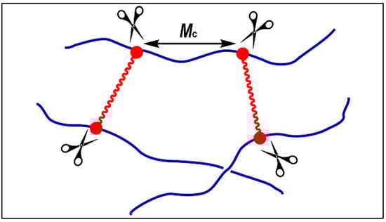 The scissors effect in the conetworks and the Mc between the two crosslinking points, (the red polymer chains represent the macromonomer crosslinker).