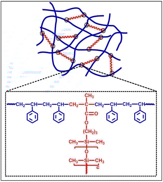Figure 6 summarizes the observations presented for the Fox–Flory-type correlation between the Tg and 1/Mc for the PSt-l PDMS and the PSt-l-PDMS/DVB conetworks and the Tg and Mn literature data for polystyrene homopolymers [86,87]. As this plot indicates, these data show that both the 1/Mc and 1/Mn,PSt dependence for the conetworks and PSt homopolymers, respectively, exhibits the same trend, validating the scissors effect of the PDMS macrocrosslinker on the glass transition behavior of PSt in the conetworks. These findings indicate that the junction points between the PDMS macrocrosslinker and the crosslinked PSt chains significantly interrupt the mobility of the PSt chains, as illustrated in Scheme 3, by displaying the structure of the junction points in the conetworks. The difference in the chain mobility between the PDMS macrocrosslinker and the crosslinked PSt chains leads to chain segments of PSt with molecular weight of Mc having the same mobility, and thus, glass transition temperature as PSt homopolymers with the same Mn,PSt. As a result, the Tg versus 1/Mc plot shows Fox–Flory-type dependence. This explanation of the scissors effect by the macrocrosslinker is supported by the results of previous solid-state NMR experiments with poly(N,N-dimethylaminoethyl methacrylate)-l-polyisobutylene (PDMAEMA-l-PIB) conetworks prepared with deuterated methacrylate-ended PIB [92]. As found in this study, the more mobile PIB macrocrosslinker with lower Tg significantly influences the mobility of the crosslinking point, and this results in lower Tg of the PDMAEMA component than that of its homopolymer, similar to the investigated PSt-l PDMS and PSt-l-PDMS/DVB conetworks.