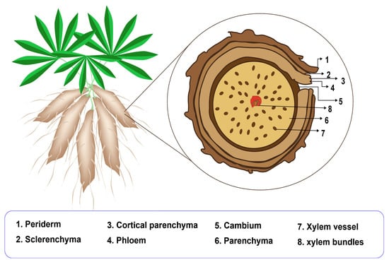 Figure 1. Cassava plant and cross-section of cassava roots. Adapted from [6].