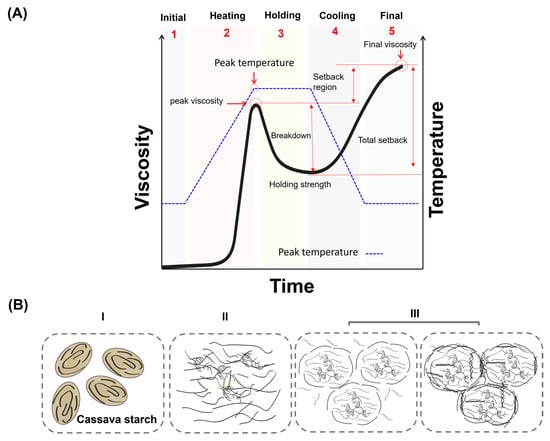 Figure 5. (A) Typical Rapid Visco Analyzer (RVA) profile of the pasting phenomenon of cassava starch. (B) Mechanism of starch changes in water: (I) Native starch granules, (II) Gelatinization, (III) Cooling, and (III) Retrogradation.