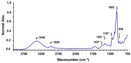 Figure 6. Principal bands of the ATR–FTIR spectrum of cassava starch. The cassava starch sample was obtained from a local market in Cali, Colombia. Spectrum adapted from [138].