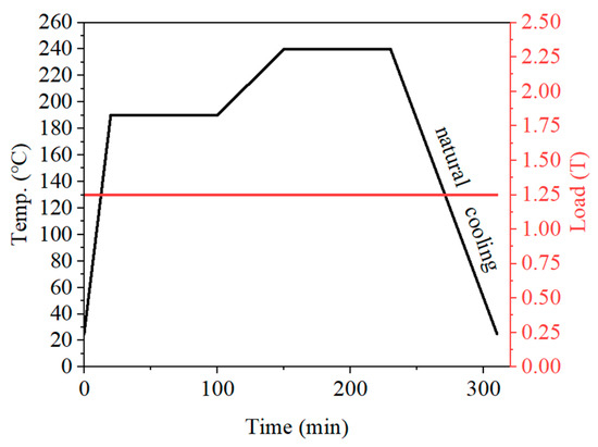 The hot-pressing sintering process consists of two steps: solution mixing and hot-pressing sintering. Mix the ultra-high molecular weight polyethylene powder, polytetrafluoroethylene particles and polyvinyl alcohol powder in the proportion shown in Table 1 simultaneously through ultrasonic vibration and mechanical stirring for 2 h (as PVA1788 has a low degree of polymerization, the stirring time is longer), and then place them in a drying oven for use. The dried UPPs sample powder was taken out for vacuum filtration and cleaning. This process was repeated three times. The washed UPPs sample powder was placed in a forced convection drying oven at 80 degrees Celsius for drying for 24 h. The dried UPPs sample powder was formed at room temperature through a hot press mold. The heating and pressure curves are shown in Figure 1 (The black line represents the temperature and the red line represents the loading force).