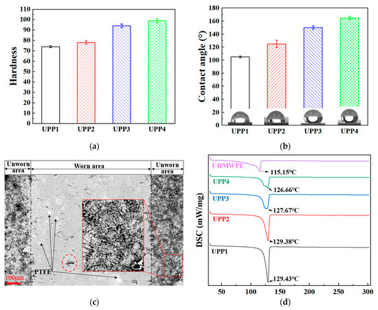(a) Hardness, (b) contact angles, (c) surface topography of UPPs, (d) DSC.