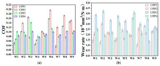 The coefficient of friction (COF) of UPPs exhibited a trend of initially increasing and then decreasing with increasing PTFE content. Under low testing speeds, a lower PTFE content proved sufficient to facilitate the formation and spreading of transfer films. As the testing speed increased, intensified wear generated more PTFE debris particles, which underwent processes of exfoliation, transfer, and ultimately adhesion to the counterface steel ball to form a transfer film. Moreover, both elevated testing loads and speeds resulted in an overall increase in COF across all UPPs compositions. However, consistent with previous studies [24,25], an optimal PTFE content range existed for achieving minimal COF, rather than a monotonic decrease with higher PTFE content. Notably, the UPPs materials demonstrated exceptionally low friction characteristics, with all four formulations maintaining COF values below 0.2 under conditions W1–W9. Particularly, UPP1 exhibited ultra-low COF values (0.043) under W1, W4, and W7 conditions.