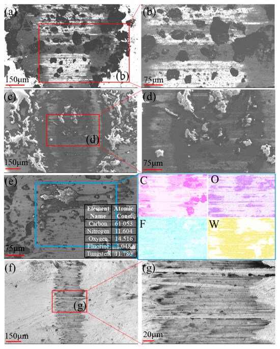 When the load decreased from 10 N to 2 N, minimal stratified accumulations persisted on the steel surface (Figure 5e). EDS analysis revealed uniform fluorine distribution across most wear regions, indicating formation of an ultrathin transfer film. This effective film coverage with limited multilayer accumulation accounted for the substantial friction coefficient reduction [27] and low wear rate of UPP1 (Figure 3b). Further frequency reduction dramatically minimized the wear scar dimensions (Figure 5f). A narrow wear track with uniform thick transfer film coverage was observed (Figure 5g). This high-quality transfer film contributed to the lowest friction coefficient under low-load/low-speed conditions. Although the transfer film exhibited smaller coverage area, its uniform distribution and greater thickness resulted in slightly higher wear rate compared to high-speed conditions (Figure 3b).