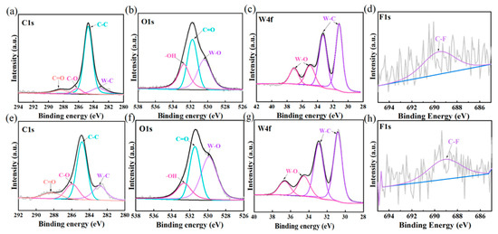 It is difficult to confirm the chemical changes during the friction and wear process only through rate morphology analysis, so XPS assistance is usually required. In the C1s spectra of Figure 6a,e, the peak at 289 eV is the C=O characteristic peak, which comes from the carboxylic acid carbonyl carbon [28]. The C-O bond at the 286 eV position is the characteristic peak of the carboxyl group in carboxylic acids [29]. In the O1s spectra of Figure 6b,f, the peak at 531 eV is the characteristic peak of C=O, and the -OH at 533 eV is the typical hydrogen peroxide peak of carboxylic acid. The -OH characteristic peak located at 532.5 eV in the O1s spectra of Figure 6b,f is derived from the carbonyl oxygen of the carboxylic acid. At 530 eV is the characteristic peak of W-O, which proves that perhaps WO3 is generated. In Figure 6c,g, the typical oxidized state of WO3 (W6+) appears at 35–38 eV, with a characteristic peak structure (4f7/2 and 4f5/2, with an interval of approximately 2.1 eV and an intensity ratio of 4:3). The W-O characteristic peak in Figure 6g is slightly shifted. The W 4f peak shifts towards the direction of high binding energy. The W-C bond combined with the C 1s peak at 283.5 eV may point to the presence of tungsten carbide. The high carbon content in Figure 5e also proves this point [30]. Moreover, the W 4f7/2 peak at 33–34 eV indicates the presence of tungsten oxide WO2 [31]. Finally, the C-F characteristic peaks in Figure 6d,h indicate the existence of the transfer membrane [32]. To sum up, it indicates that the oxidation of UHMWPE to form carboxylic acid occurs at the friction interface. The specific process is as follows: