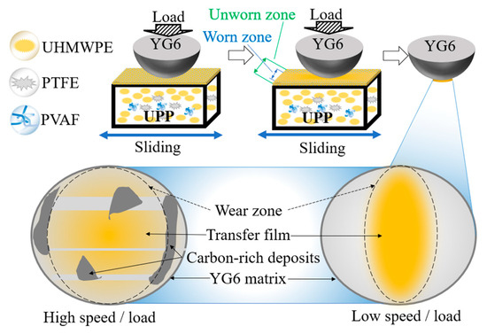 Figure 7 shows the schematic diagram of friction mechanism of UPPs. During the friction process, the frictional cutting effect of the steel ball on the UPPs surface material disrupted the superhydrophobic microstructure, and the morphology of the wear mark area changed. Then, part of the surface material is peeled off and transferred to the surface of the steel balls of the friction pair, forming a transfer film, and the friction coefficient decreases, entering the stable period. At this point, the interfacial friction changes from “UPP-YG6” to “UPP-transfer film”, maintaining a low coefficient of friction. Under low-speed or low-load conditions, a thin polymer transfer film covering the surface of the steel balls is formed. Under high-speed or high-load conditions, the stripped surface material fails to fully spread and form a transfer film during the process of being transferred to the surface of the steel ball, and adheres to the surface of the steel ball under the effect of frictional temperature rise. As more and more materials are transferred by friction and shearing, these carbon-rich adherend gradually become larger and thicker, eventually forming carbon-rich zones. The surface smoothness drops sharply, the friction force increases, and the friction coefficient is higher than that under low-speed and low-load conditions. These carbon-rich accumulation areas are large in area, uneven in thickness and high in hardness, like “hard particles” scraping UPP, resulting in a high wear rate.