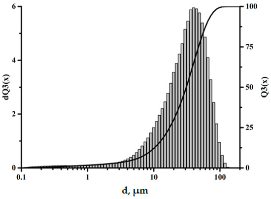 The size and distribution of filler particles significantly affect the characteristics of polymer composites [23,24]. The fractional composition of the microspheres used in this work can be characterized as monomodal, with the particle sizes varying from 0.5 to 100 μm. The largest volume fraction is accounted for by particles 30–60 μm in size, as shown in Figure 2. The data obtained using scanning electron microscopy (SEM) also confirm this size range, as shown in Figure 3.