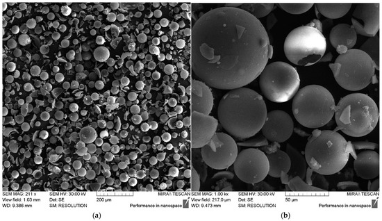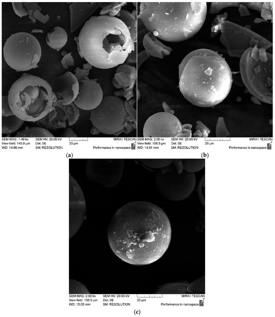 The main advantages of spherical fillers are their small surface-area-to-volume ratio, which promotes low adsorption of the binder; their perfect shape, which ensures good wetting of the particles and a uniform distribution of stresses in the material; the possibility of surface modification; and the high resistance of polymer composite materials filled with spherical fillers to stretching, compression, and water resistance, as well as the high heat resistance of ASMs (melting point: 1400–1500 °C). Moreover, the chemical composition of ASMs ensures their high resistance to acids and alkalis, and they are pH-neutral and do not affect the chemical composition or reactions of materials or products in which they are used [25,26,27].